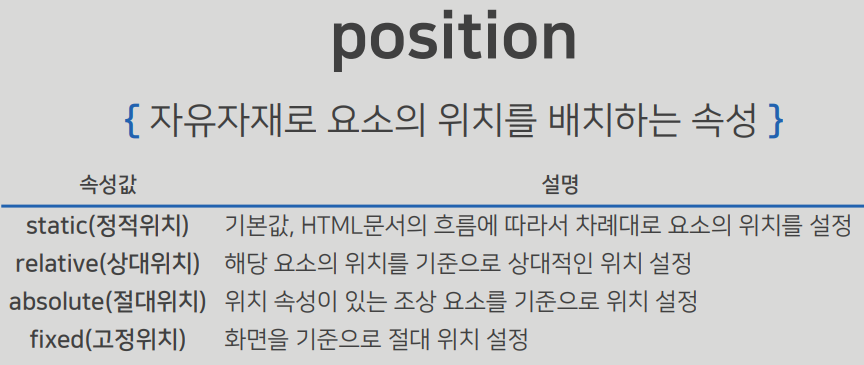 position: absolute;/*부모가 absolute 혹은 relative 혹은 fixed 일때만 위치선정 가능, 만약 부모 position이 없을경우 혹은 static일경우 body를 기준으로 적용됨*/